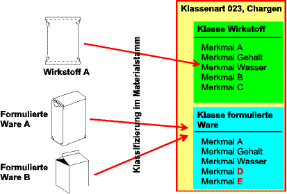 Waren A und B werden hingegen der Klasse formulierte Ware zugeordnet. Der Sinn dieser Ordnung liegt nun darin, dass in weiteren Prozessen durch Chargesuchstrategien Chargen über ausgewählte Klassenmerkmale in den Chargenklassen schnell gesucht werden können. |