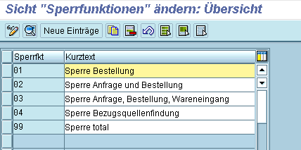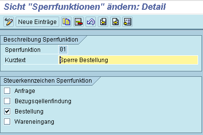 Im Folgenden sehen Sie die Ausprägung für die Sperrfunktion 01 Sperre Bestellung. Die Steuerkennzeichen sind selbsterklärend.