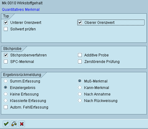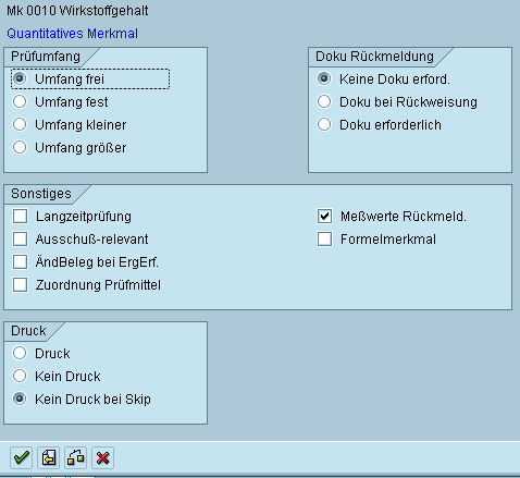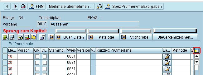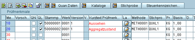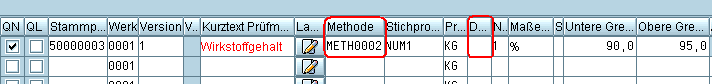 In obiger tabellarischen Darstellung, wie schon erwähnt, haben Sie natürlich auch alle Eingabemöglichkeiten, wie z. B. die Methodenauswahl im Feld Methode (METH0002) oder die Auswahl einer Dynamisierungsregel im Feld D.... Die Eingabe von Stammprüfmerkmalen, die mit allgemeinen Merkmalen (Klassenmerkmalen) verknüpft sind, wird hier gezeigt! Die abweichende Vorgehensweise zur Pflege eines Prüfplan ohne die Verwendung von Stammprüfmerkmale, sondern nur auf Basis von Prüfmerkmale, wird hier gezeigt! |