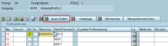 Geben Sie in das Feld Stammprüfmerkmal die Stammprüfmerkmalsbezeichnung ein und markieren das Feld QN (quantitatives Merkmal, gelbe Markierung). Durch diese Markierung helfen wir dem System, da wie schon erwähnt, die Merkmale nur minimalistisch gepflegt sind, ein bisschen nach! |