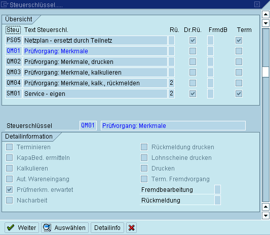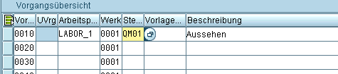 Der Arbeitsplatz und das Werk dienen zur organisatorischen Gliederung des Prüfauftrags (Wo soll Was geprüft werden?) und hier legen Sie fest, dass die Prüfungen zum Vorgang 0010 z. B. im Labor 1 und zum Vorgang 0020 im Labor 2 oder vielleicht mit Hilfe eines Subsystems (LIMS), im Werk 0001 durchgeführt werden soll. Auch wenn das Feld Arbeitsplatz kein Mussfeld ist, sollten Sie eben diesen oben genannten organisatorischen Gründen einen angeben! Das Feld Steuerschlüssel ist ein Mussfeld und hier legen Sie fest, welche betriebswirtschaftlichen Vorgänge mit dem Prüfplanvorgang verknüpft werden. Im folgenden Beispiel wird der Steuerschlüssel QM01 gewählt (Bild 2): | ||||||||||||||||||