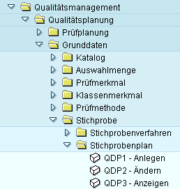 Mit Hilfe eines Stichprobenplans können Sie abhängig vom Losumfang den Stichprobenumfang festlegen. D. h., Sie können z. B. für einen Wareneingang mit einer Losgröße von 1000 Stück festlegen, dass für eine “normale” Prüfung der Stichprobenumfang 3 Stück und für eine “verschärfte” Prüfung der Stichprobenumfang 8 Stück beträgt. Stichprobenpläne sind im Zusammenhang mit Stichprobenverfahren (2. Szenario) und Dynamisierungsregeln zu sehen. Die Transaktionen, um Stichprobenpläne zu pflegen, finden Sie im Menübaum an folgender Position (Bild 1): |