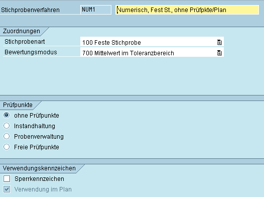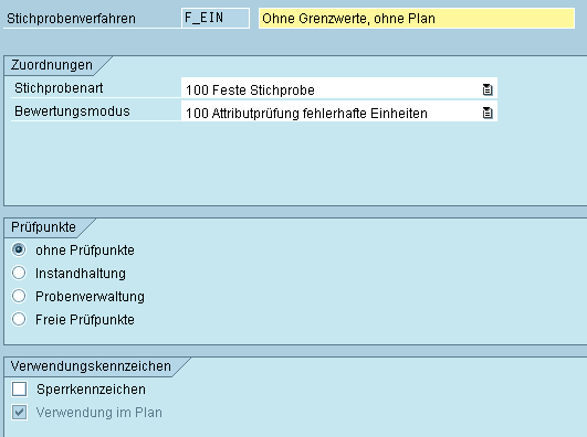 Im Bereich Verwendungskennzeichen können Sie erkennen, ob das Verfahren schon in einem Prüfplan verwendet (Verwendung im Plan) wurde und daher nicht mehr gelöscht, sondern nur noch gesperrt (Sperrkennzeichen) werden kann. In Bild 4, obwohl diese Stichprobenverfahren gerade angelegt wird, ist das Verwendungskennzeichen schon gesetzt. Es hat Beispielcharakter! Nachdem Sie die nötigen Eingaben gemacht haben, gehen Sie mit der |
