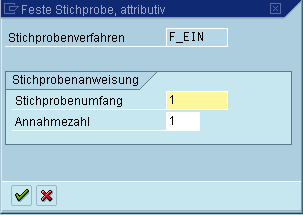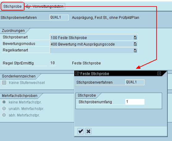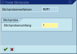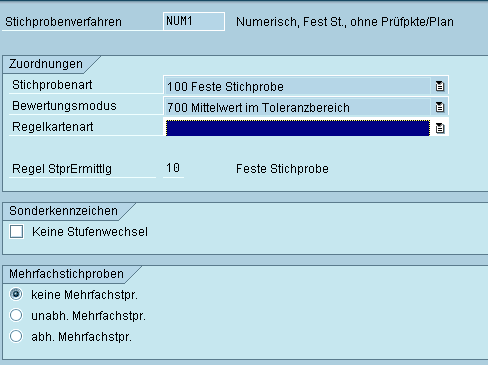 Wenn im Bereich Sonderkennzeichen das Kennzeichen Keine Stufenwechsel aktiviert wird, wird für Prüfmerkmale, denen dieses Verfahren zugeordnet wurde, keine Qualitätslage geführt und somit auch kein Stufenwechsel durchgeführt. Da in diesem Szenario dieses Verfahren auch für dynamisierte Merkmale genutzt werden soll, wird das Kennzeichen nicht gesetzt. Im Bereich Mehrfachstichproben wird Option keine Mehrfachstpr. gewählt (siehe auch Stichprobenplan). Nach dem Drücken der Schaltfläche Stichprobe geben Sie den Stichprobenumfang ein: |