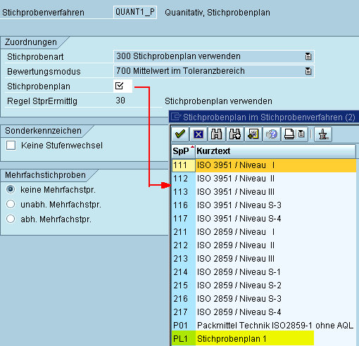Im nächsten Bild (F5) wählen Sie im Feld Stichprobenplan den gewünschten oder von Ihnen vorher angelegten Stichprobenplan, hier als Beispiel PL1 Stichprobenplan 1, aus: |