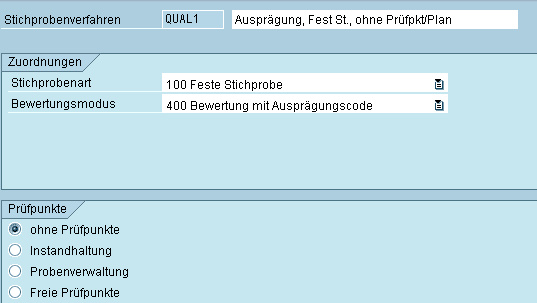 Im Bereich Prüfpunkte wird die Option ohne Prüfpunkte gewählt, da dieses Verfahren nicht für Prüfungen genutzt werden soll, die weitere Informationen über das zu prüfende Objekt, wie z. B. Probennahmestelle oder Kiste Nr. nn, erwarten. Sollen derartige Zusatzinformationen mit erfasst werden, ist die Option Freie Prüfpunkte zuwählen.