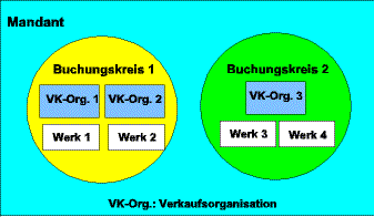 Das übergeordnete Objekt der Organisationsstrukturen ist der Mandant und entspricht z. B. einem Konzern oder einem dementsprechend großen Geschäftsbereich. Innerhalb eines Mandanten steht eine Datenbasis (Stamm- und Bewegungsdaten, Customizingeinstellungen) zur Verfügung. Der Buchungskreis ist eine bilanzierende Einheit im Sinne einer rechtlich selbständigen Firma und ist ein